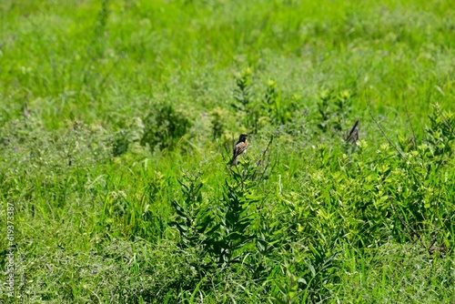 Bird perched on a plant in a lush green grassy field on a sunny day