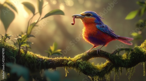 bird with vibrant plumage holding a worm in its beak, perched gracefully on a moss-covered branch in the soft glow of dawn