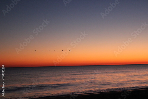 Birds flying over ocean during sunset