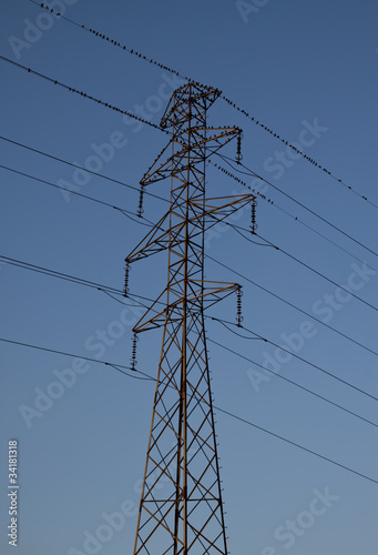 tension, wire, electricity, bird, blue, clean, cloud, energy, landscape, pylon, seat, sky, sloop, small, sun, transport