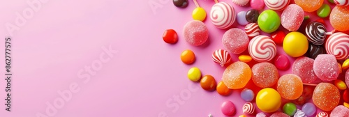 Birthday concept. Colorful assorted sweet candies on background, banner, top view