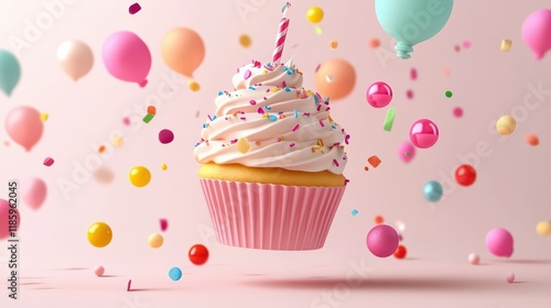 Birthday greetings. Celebrate with a pastel cupcake topped with a candle, surrounded by a balloon of birthday joy.