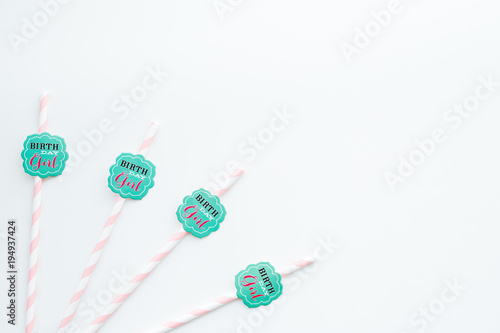 Birthday party background. Lettering Birthday girl on drink straws on white top view copy space