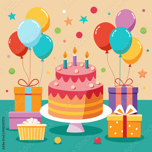 Birthday Party Celebration. Cake. Balloons. and Gifts