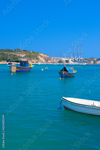 BIRZEBBUGA, MALTA - JUNE 28, 2023: the Colorful small fishing boats moored with buoys in St George's Bay, in Birzebbuga, Malta. This was on a sunny afternoon.