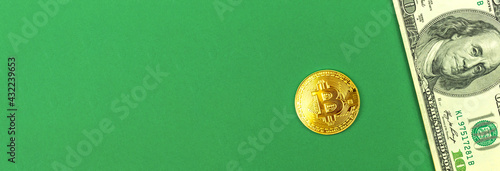 Bitcoin exchange banner background, crypto currency business office desk and workspace photo, top view and copy space