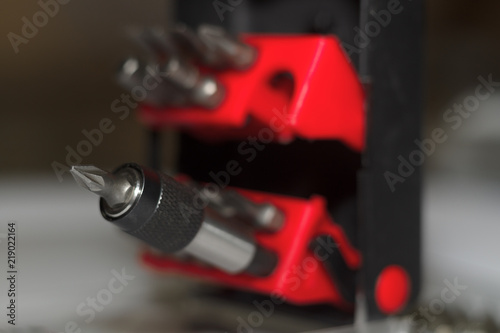 Bits holder in box and many tool bits on white background. Close-up view. Red element in plastic box.