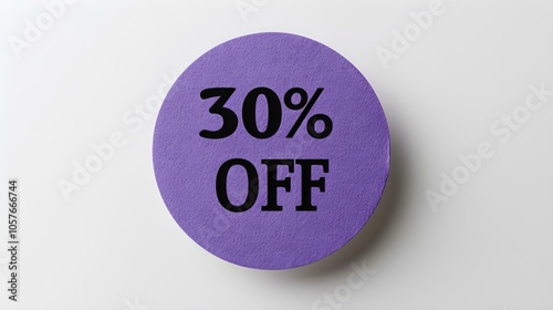 Black '30% OFF' Text on a Dark Purple Round Paper Note. White Background with Copy Space