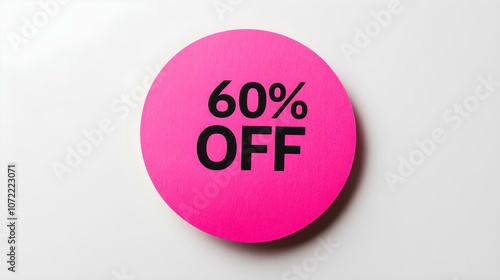 Black '60% OFF' Text on a Magenta Round Paper Note. White Background with Copy Space