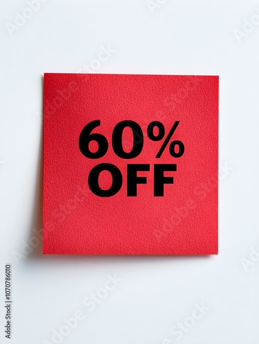 Black '60% OFF' Text on a Red Square Paper Note. White Background