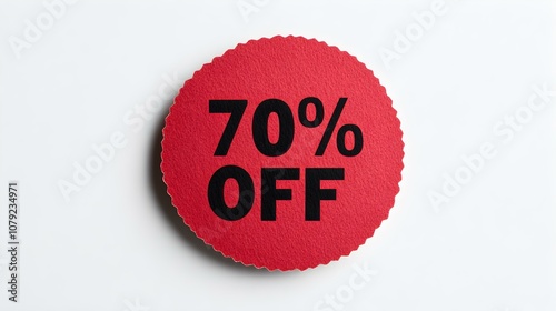 Black '70% OFF' Text on a Dark Red Round Paper Note. White Background with Copy Space