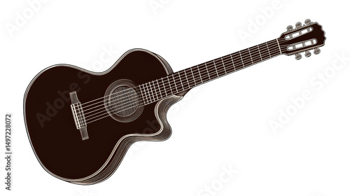 Black acoustic guitar with wooden neck and six strings, isolated transparent background, showcasing sleek and modern design
