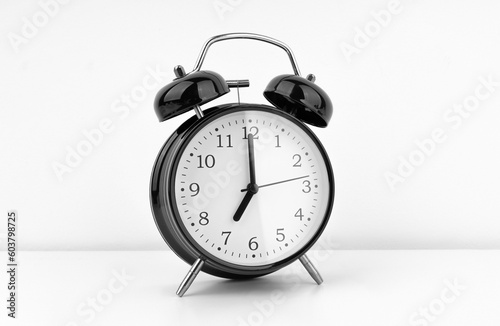 Black alarm clock on white wall background