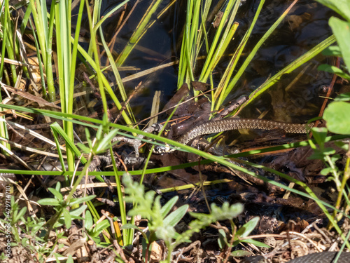 Black and brown grass snake (Natrix natrix) getting out of the water in sunlight. Focus on eye and head of eurasian non-venomous snake showing the distinctive collar