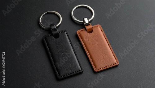 keychain, leather, black, brown, stitching, rectangular, rounded, metal, rivet, key, ring, accessory, hard-wearing, minimal, classic, elegant, craftsmanship, hand-made, textured, surface, contrast, functional, stylish, everyday, carry, small, item, detail, design, practical, modern, vintage, rugged, masculine, refined, tactile, utility, compact, aesthetic, premium, sleek