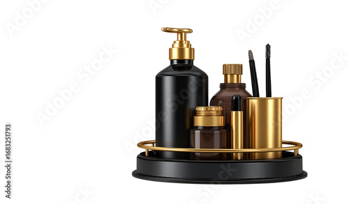 Black and gold cosmetic bottles and makeup brushes on tray isolated on a transparent background