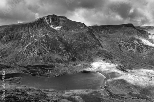 Black and white Aerial view of flying drone Epic dramatic Autumn landscape image of Llyn Idwal in Devil's Kitchen in Snowdonia National Park with gorgeous light