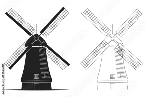 vector, illustration, scalable, icon, windmill, architecture, building, historical, traditional, agro, industry, energy, power, agriculture, rural, countryside, farm, machinery, mechanism, engine, mill, wind, breeze, air, movement, rotation, sail, blade, propeller, structure, design, vignetting, drawing, outline, silhouette, graphic, art, clip art, symbol, iconography, vintage, retro, heritage, landmark, scenic, natural, resource, engineering