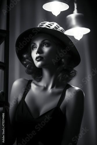 black and white, attractive model capturing the charm of silent cinema on set