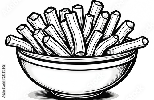 Black and white cartoon of french fries in a bowl. Hand drawn chips with a retro feel. Silly, simple, and cheerful illustration ideal for menu or decoration.