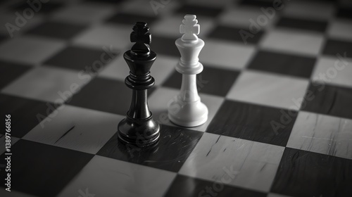 Black and white chess pieces on a chessboard. The black king is in the foreground, and the white king is in the background.