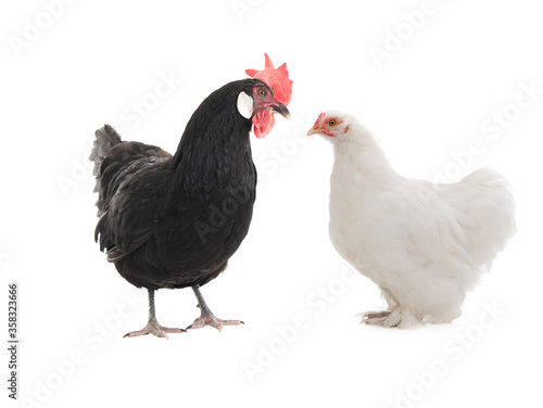 2, style, racked, crest, design, black, studio, animal, bird, poultry, farm, bird, white, hen, domestic, isolated, chicken, fowl, animal, farming, rural, feather, meat, female, real, natural, colourful, chick, economy, husbandry, nature