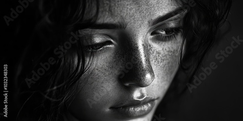 black, and, white, monochrome, portrait, woman, girl, face, closeup, eye, closed, looking, down, sad, pensive, thoughtful, emotion, expression, beauty, natural, freckle, skin, soft, delicate, light, shadow, hair, dark, curl, wavy