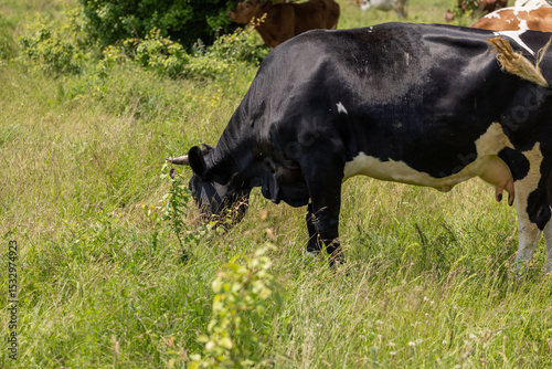 cow, grazing, meadow, pasture, grass, farm, agriculture, farm animal, rural, nature, countryside, green, sunny, summer, farmland, animal, bovine, milk, beef, dairy, farming, field, landscape, eating, healthy, peaceful, idylli, sustainable, environment, herd, animal, fed, free, range, organic, outdoors, daytime, mammal, wildlife, horn, black, white, spotted