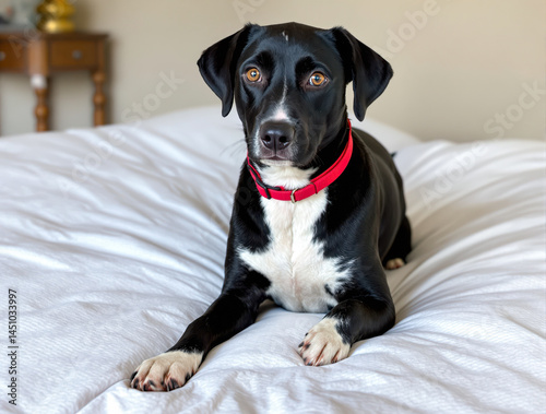 dog, pet, animal, mammal, canino, black, white, red, collar, eye, fur, paw, comfortable, relaxed, peaceful, calm, cute, adorable, sweet, gentle, friendly, happy, content, home, bed, bedchamber, house, domestic, companion, loyal, love, affection, trust, comfort, warmth, soft, bedding, indoor, lifestyle