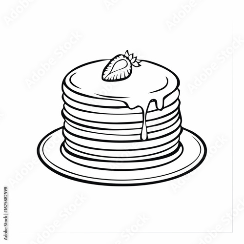 battercake, strawberry, sirup, dessert, stack, food, breakfast, sweet, delicious, meal, outline, drawing, black, white, bakery, epicure, tasty, deliciously, cookery, fresh, homemade, receipe, cooking, culinary, brunch, pastry, indulgence, treat, fluffy, gold, brown, sugar, cream, topping, fruit, bake, confectionery, product, eat, dish, plate
