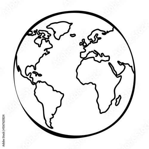 Black and white earth globe illustration with continents outlined. Vector hand-drawn doodle illustration