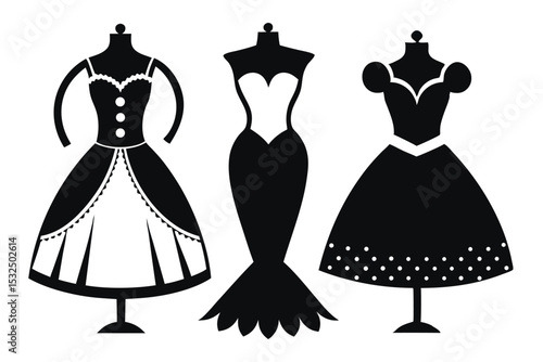 Black and White Fashion Silhouettes Dresses on Mannequins with Detailed Designs and Skirt Styles