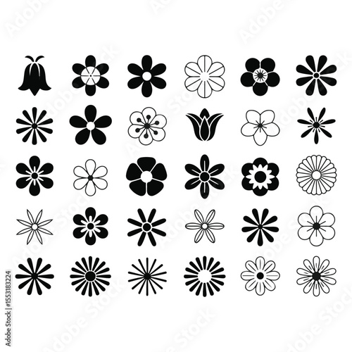flower, floral, silhouette, black, white, monochrome, blossom, flower petals, vector, graphic, design element, illustration, outline, simple, minimalist, decorative, spring, summer, nature, isolated, pattern, set, collection, daisy, tulip, botanical