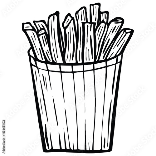 french fries, fries, food, snack, fast food, fried, potato, illustration, drawing, black-and-white, vector, clip art, take-out, bucket, container, cartoon, simple, outline, monochrome, graphic, isolated, design, vintage, retro, vignetting, doodle, cookery, eatery, junk food, delicious, deliciously, treat