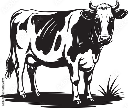 cow, cattle, bovine, dairy cow, farm animal, farm animal, animal portrait, black-and-white, silhouette, vector, illustration, graphic, design, standing, farm, agriculture, mammal, animal body, horn, ear, eye, nose, muzzle, tail, udder, leg, hoof, grass, shadow, black, white, isolated, simple, clean, graphic design