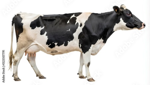 Black and white Holstein milk dairy cow, bovine, cattle, Production agriculture farming mammal with Udders visible. isolated on white background