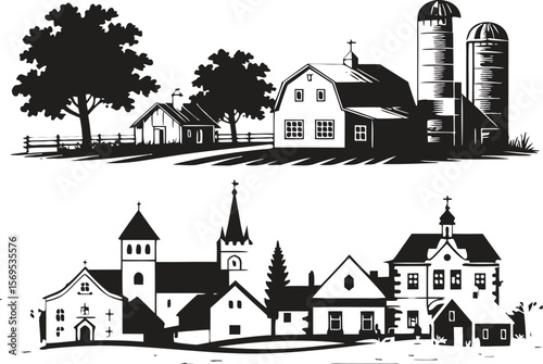 Black and White Illustration Farm and Town Silhouette Landscape with Buildings and Trees