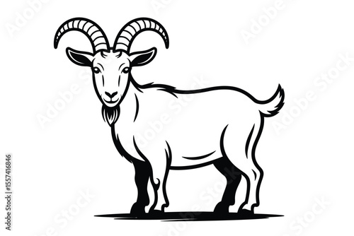goat, animal, mammal, wildlife, farm animal, horned, horn, beard, black-and-white, vector, illustration, graphic, outline, silhouette, standing, isolated, white background, simple, minimalist, design element, logotype, icon, symbol, drawing, artwork, clip art, agriculture, farm animal, farm, 250