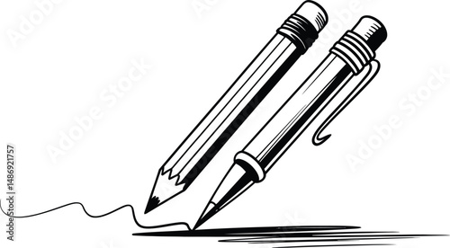 Black and white illustration of a pencil and a pen writing on a plain white background