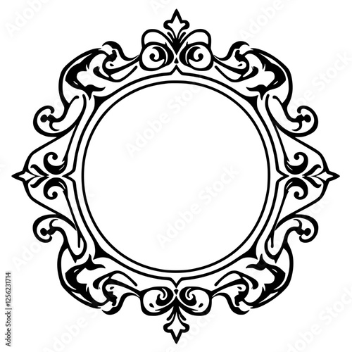 Black and white, intricate vintage filigree frame with a circular empty space in the middle.