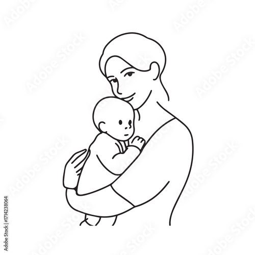 Black and white line art of a beautiful mother lovingly embracing her baby minimalist tender illustration