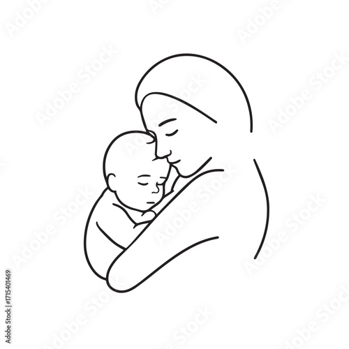 Black and white line art of a beautiful mother lovingly embracing her baby minimalist tender illustration