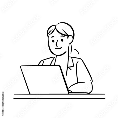 Black and white line art of a beautiful successful career woman working at desk with laptop illustration