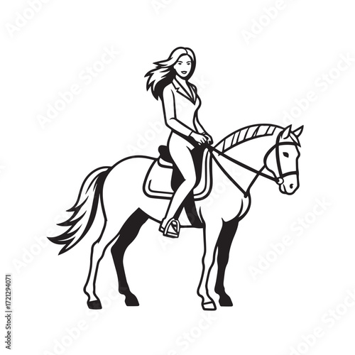 woman, horse, riding, equestrian, beautiful, body, elegant, stylish, outfit, vector, illustration, line art, black, white, drawing, vignetting, outline, silhouette, graceful, confident, minimal, minimalist, simple, chic, fashion, strong, female, rider, horseback, lifestyle, graphic, design, modern, artwork, aesthetic, decorative, posh, posture, athletic, feminine, contemporary, sport, leisure, stable, countryside, charming, equine, composition