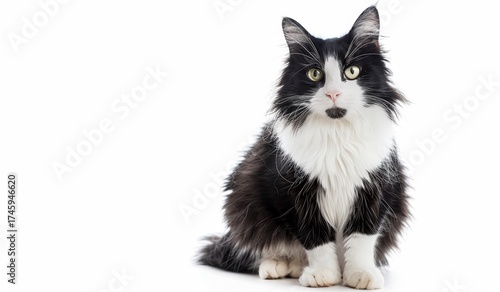 Black and white Maine Coon cat sitting on floor with full body looking at camera, isolated on white background. Domestic feline pet portrait in monochrome.