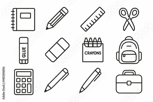 notebook, crayons, ruler, scissors, backpack, glue, crayons, pen, calculating machine, eraser, outline, black, white, school, supply, set, stationary, drawing, vignetting, bag, case, educational, office, study, classroom, organised, graphic, design, simple, minimalist, vector, icon