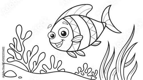 Black and white page for baby coloring book. Illustration of cute fairy-tale fish swimming underwater. Printable template for kids. Worksheet for children and adults. Hand-drawn vector image