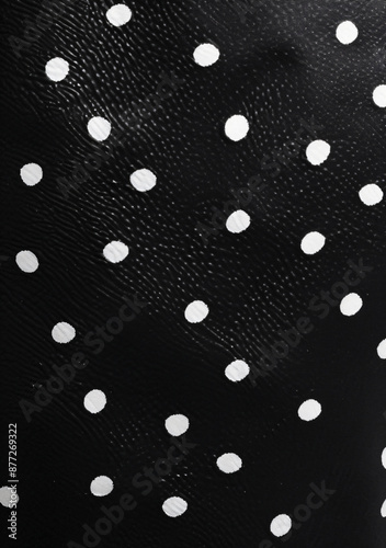 Black and white polka dot pattern on a black background in a flat lay, top view, high resolution copy space for text or logo.