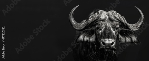 Black and white portrait of an African buffalo on black background. Wild animal in the dark, closeup. gaze into camera. banner format.