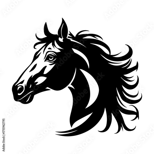 horse, animal, profile, head, mane, tail, black, white, silhouette, illustration, graphic, design, art, vector, drawing, equine, mammal, stylised, artwork, image, head shot, animal head